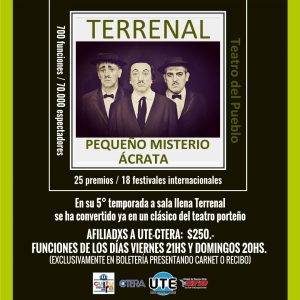 Terrenal. Pequeño misterio ácrata Escrita y dirigida por Mauricio Kartun 700 funciones / 70.000 espectadores [...]