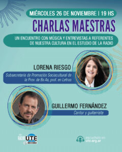 Invitadxs: Lorena Riesgo , Subsecretaria Promoción Sociocultural Prov. BS. As, Prof. Letras, Guillermo Fernández , cantor y guitarrista
