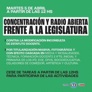El 5 de abril realizamos una concentración y radio abierta en la Legislatura de la CABA para rechazar la reforma inconsulta del Estatuto del Docente por parte del Gobierno de la Ciudad y para exigir la titularización masiva, fotográfica y con efecto cascada para lxs docentes interinxs y contratadxs de distintas áreas y modalidades que se encuentran en situación de inestabilidad laboral desde hace más de 10 años: Educación Media y modalidades, Técnica, Formación Docente e IFTS, Inicial y Primaria de los IFD, EOE, EPVS, Socio Educativa, Celadores de Comedor, Artística y Cultura.