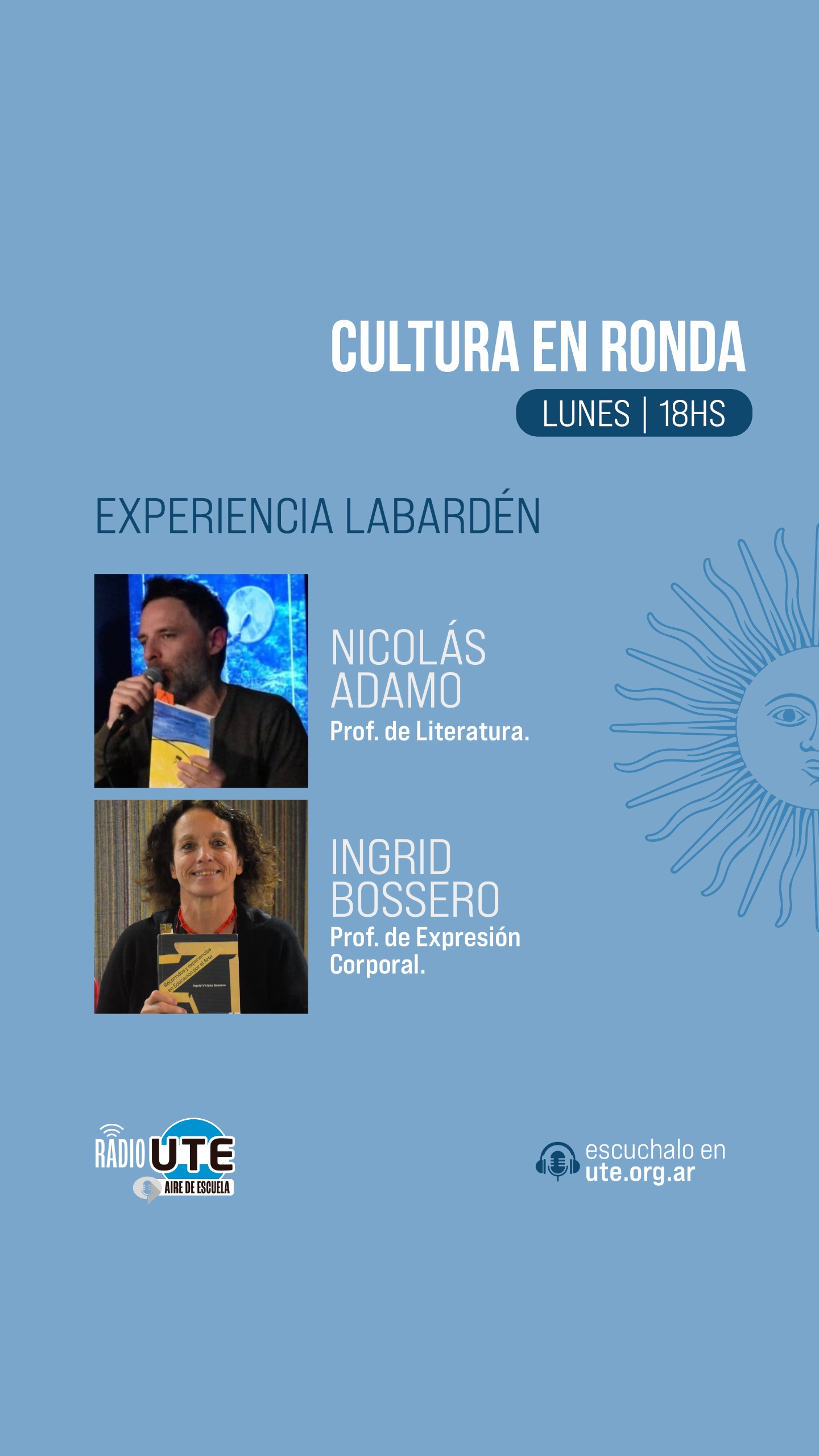 Cultura, Más Cultura, Notas y entrevistas, Noticias DestacadasCultura en Ronda. EXPERIENCIA LABARDÉN 30 Oct ✨ Cultura en Ronda ✨ EXPERIENCIA LABARDÉN🌻 Docentes esritores Invitadxs: Prof. Ingrid Bosserp y Prof. Nicolás Adamo Conducción: Nadia Dotta y Laura Rabinovich ➡️ Lunes 3/11 a las 18 h Por Radio UTE https://youtube.com/@radioute?si=MwLd2LAgb8H-piNc