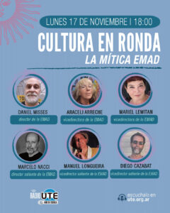 Cultura, Más Cultura, Notas y entrevistas, Noticias DestacadasCultura en Ronda. LA MÍTICA EMAD 17 Nov Cultura en Ronda La mítica EMAD🎭 Invitadxs: Daniel Misses, Araceli Arreche, Mariel Lewitan, Marcelo Nacci, Manuel Longueira, Diego Cazabat. ➡️ Lunes 17/11 a las 18 h Por Radio UTE https://youtube.com/@radioute?si=MwLd2LAgb8H-piNc