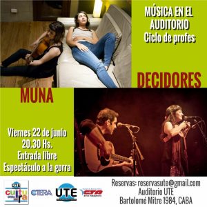 MUNA – DECIDORES. Ciclo de profes – MÚSICA EN EL AUDITORIO. Viernes 22 de junio – 20.30 Hs. A la gorra!