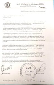 En el marco del Paro y movilización docente del pasado jueves 10 de noviembre convocado por la UTE, una representación de los Institutos de Cultura dependientes de la DGEART junto a la Secretaría de Cultura de UTE, hizo entrega de una nota dirigida a Alejandro Casavalle y al Ministro de Cultura de la Ciudad Enrique Avogadro.