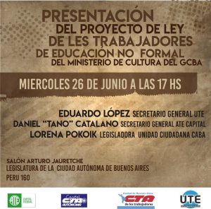 Necesitamos una ley marco que regularice nuestra situación y nos otorgue la dignidad que merecemos. Para saldar esta injustica en la que estamos inmersos decenas de miles de trabajadores, este miércoles 26 de junio a las 17 hs, presentamos en la Legislatura Porteña un proyecto de LEY DE LXS TRABAJADORXS DE EDUCACIÓN NO FORMAL DEL MINISTERIO DE CULTURA DEL GCBA, elaborado por lxs propios trabajadorxs y los gremios que nos representan: UTE y ATE, a través de la Legisladora de Unidad Ciudadana Lorena Pokoik.