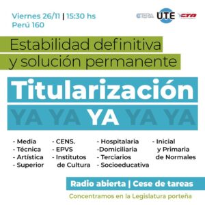 Gremial, Noticias DestacadasTITULARIZACIÓN YA! Viernes 26/11 a las 15.30 hs Legislatura porteña 25 Nov Titularización y estabilidad laboral en los Institutos de Cultura dependientes del Ministerio de Cultura de la Ciudad Viernes 26/11 – 15.30 hs- Perú 160 Concentramos en la Legislatura porteña Cese de tareas/Radio abierta